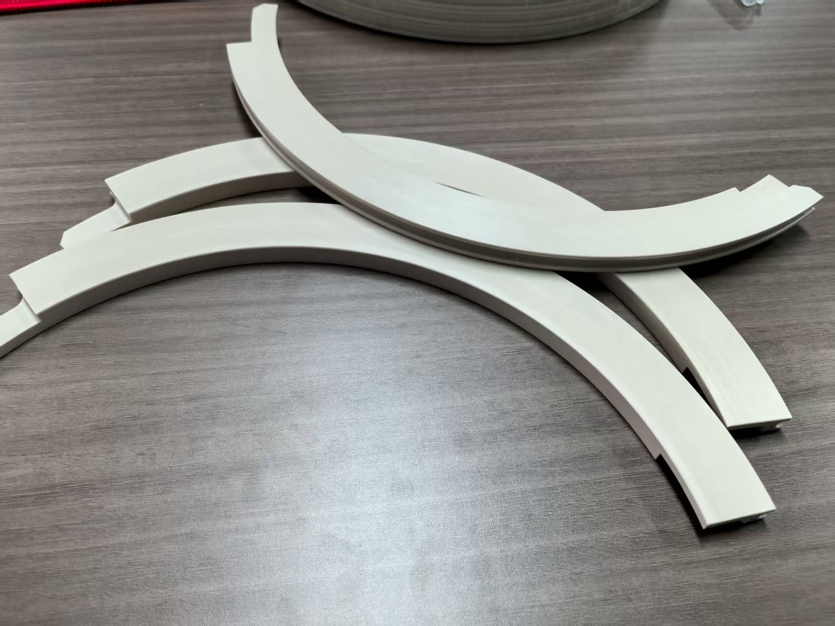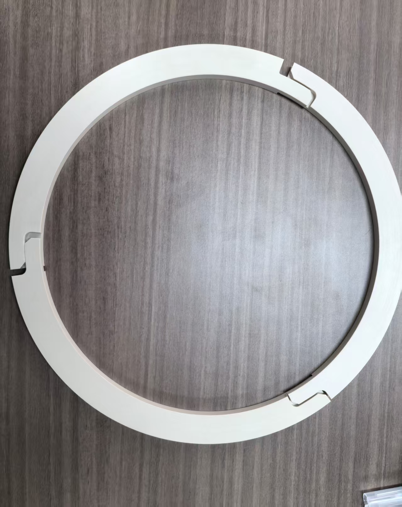 This is a custom-designed PEEK component that combines three individual segments to form a complete circle. The segments feature interlocking step joints that align precisely. An O-ring / Garter spring groove is machined on the outer diameter. Finally, a garter spring is installed in this groove to secure and hold the three segments together under tension.
